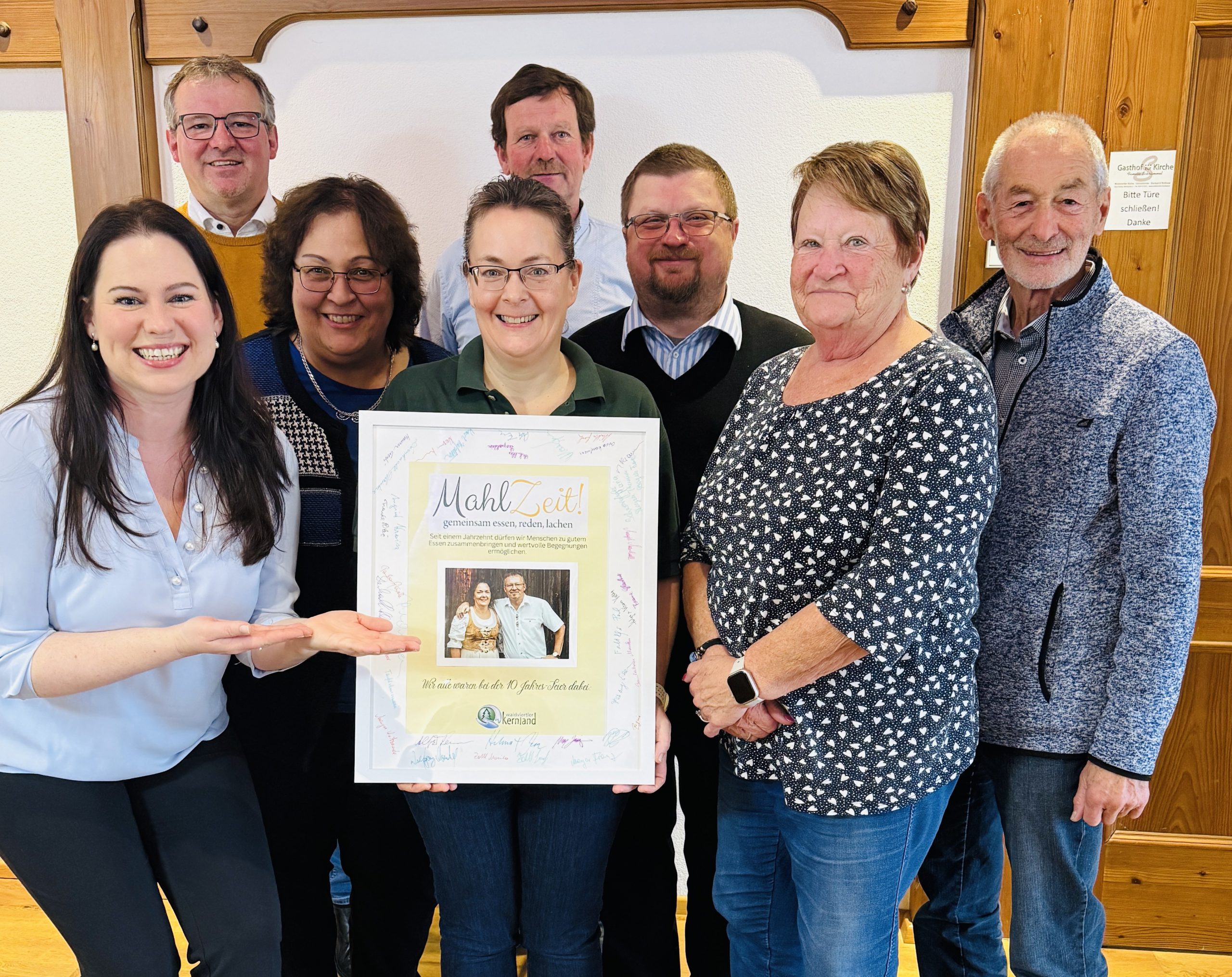 Großer Dank ging auch an Silvia und Franz Schrammel, die seit Jahren als perfekte Wirtsleute das Herzstück des monatlichen Treffens bilden. Freundlich, offen, hilfsbereit und immer mit einem köstlichen Gericht am Herd, machen sie „MahlZeit“ zu dem, was es ist: einem Ort der Begegnung, an dem sich Menschen willkommen und gut aufgehoben fühlen. Als besondere Würdigung überreichte ihnen Patricia Keller (Mitarbeiterin des Waldviertler Kernlands und Betreuerin des Projekts „MahlZeit“), ein gerahmtes Foto, auf dem sich alle anwesenden Gäste mit ihrer Unterschrift verewigt hatten.