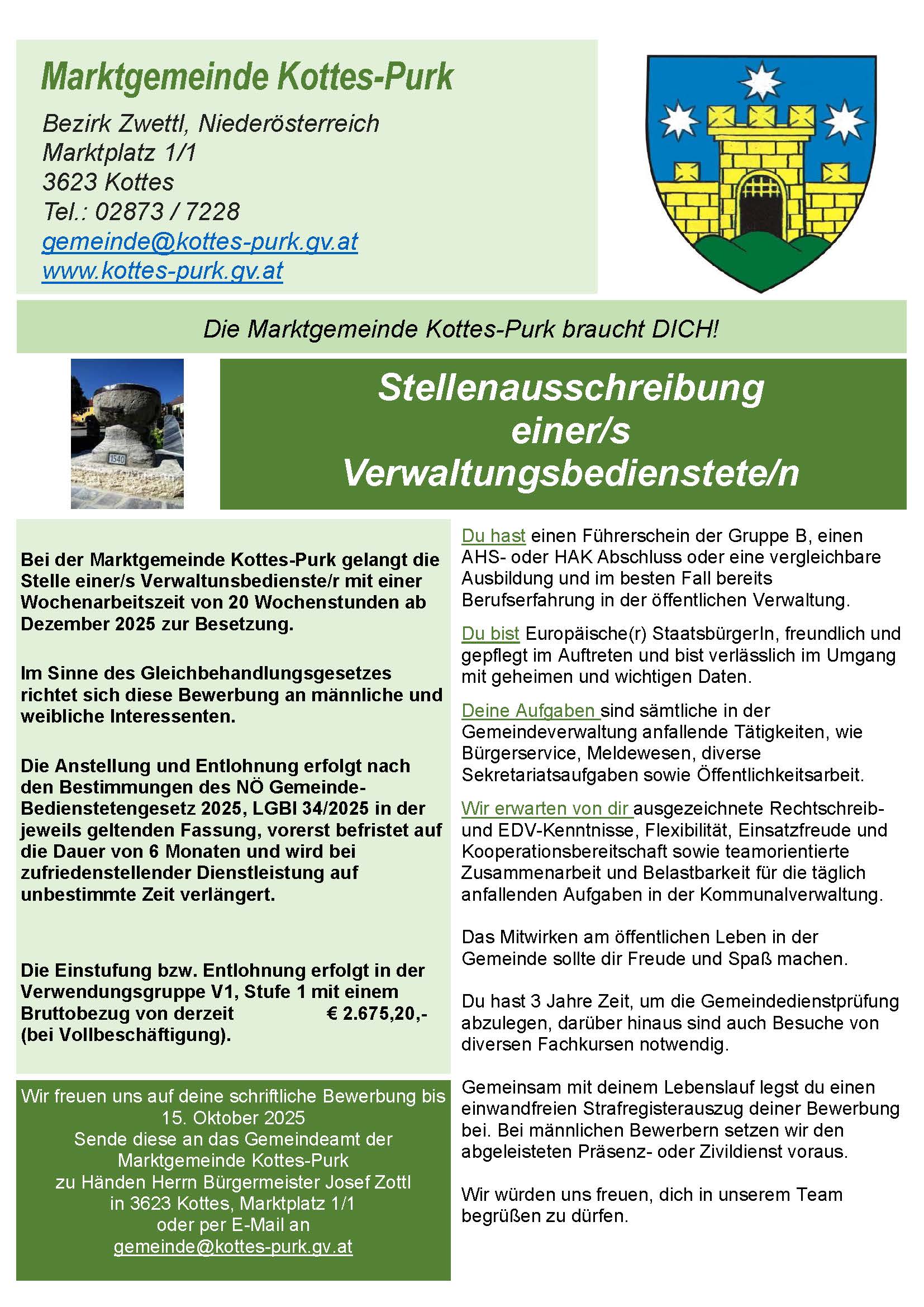 25 Sep. 2025 Die Marktgemeinde Kottes-Purk braucht DICH! – Stellenausschreibung einer/s Verwaltungsbedienstete/n von gemeinde | Eingetragen bei: Aktuelles aus der Gemeinde Kottes-Purk | 0