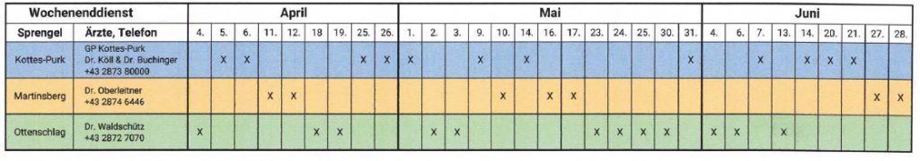 Ab 1.7.2019 umfasst der kassenärztliche Wochenend- und Feiertagsdienst ausschließlich die Zeit zwischen 8:00 Uhr und 14:00 Uhr. Ordinationsbetrieb ist von 9:00 bis 11:00 Uhr.