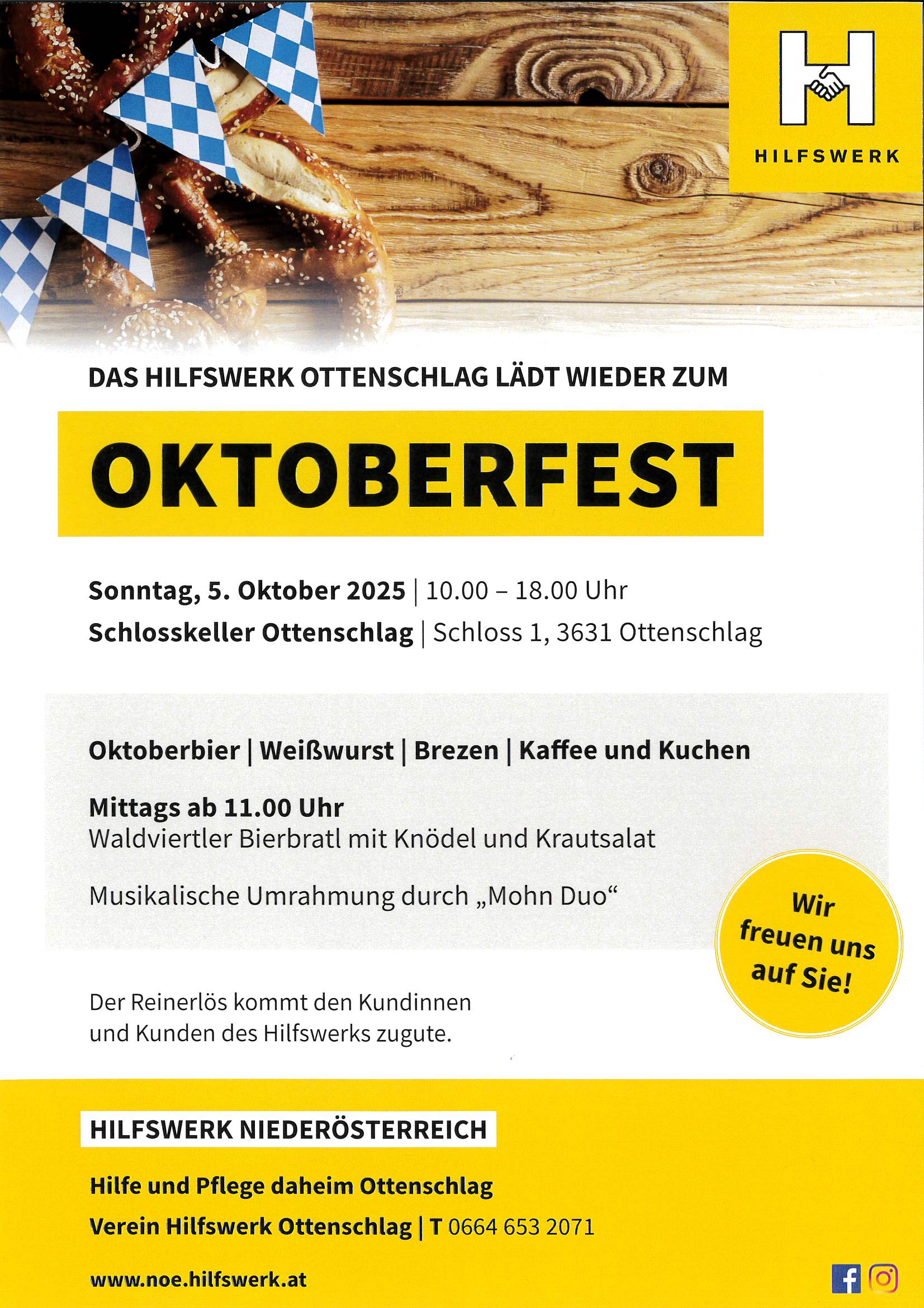 25 Sep. 2025 Das Hilfswerk Ottenschlag lädt zum Oktoberfest ein von gemeinde | Eingetragen bei: Aktuelles aus der Gemeinde Kottes-Purk | 0 Wann: Sonntag, 05. Oktober 2025 10:00 bis 18:00 Uhr Wo: Schlosskeller Ottenschlag