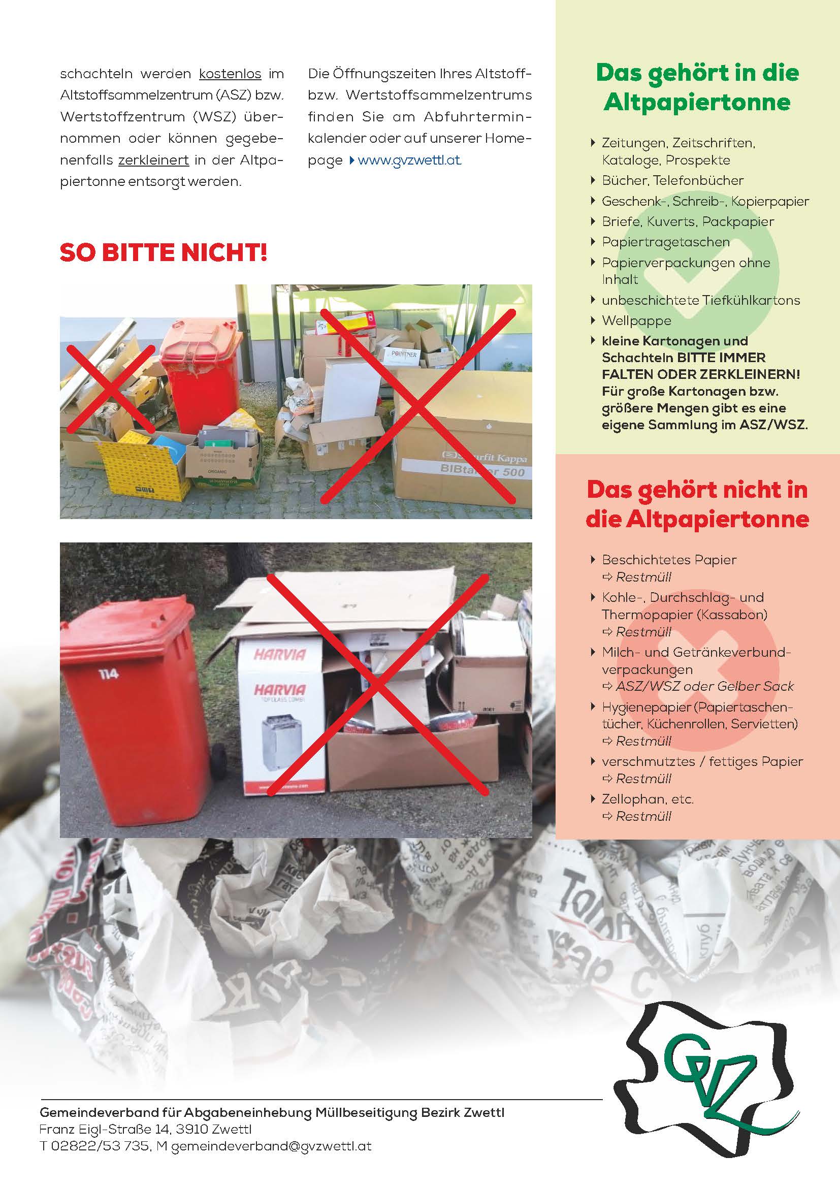 Ab Jänner 2026 werden alle neben den Containern bereitgestellten Verpackungskartons nicht mehr mitgenommen – außer es wurde vorab eine Anmeldung beim GV-Zwettl oder bei der Firma Brantner-Dürr vorgenommen.
